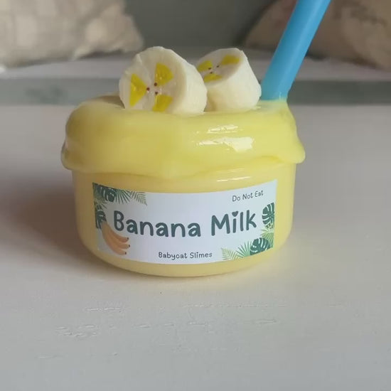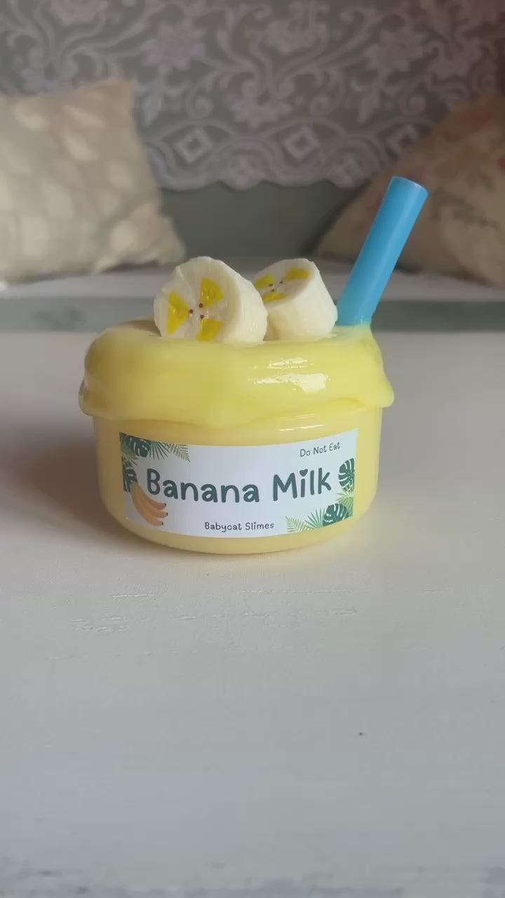"Banana Milk" is a milky clear slime with a yummy banana scent and cute banana slice and straw charms. It has a glossy, shiny look and makes super loud crisp bubble pops!