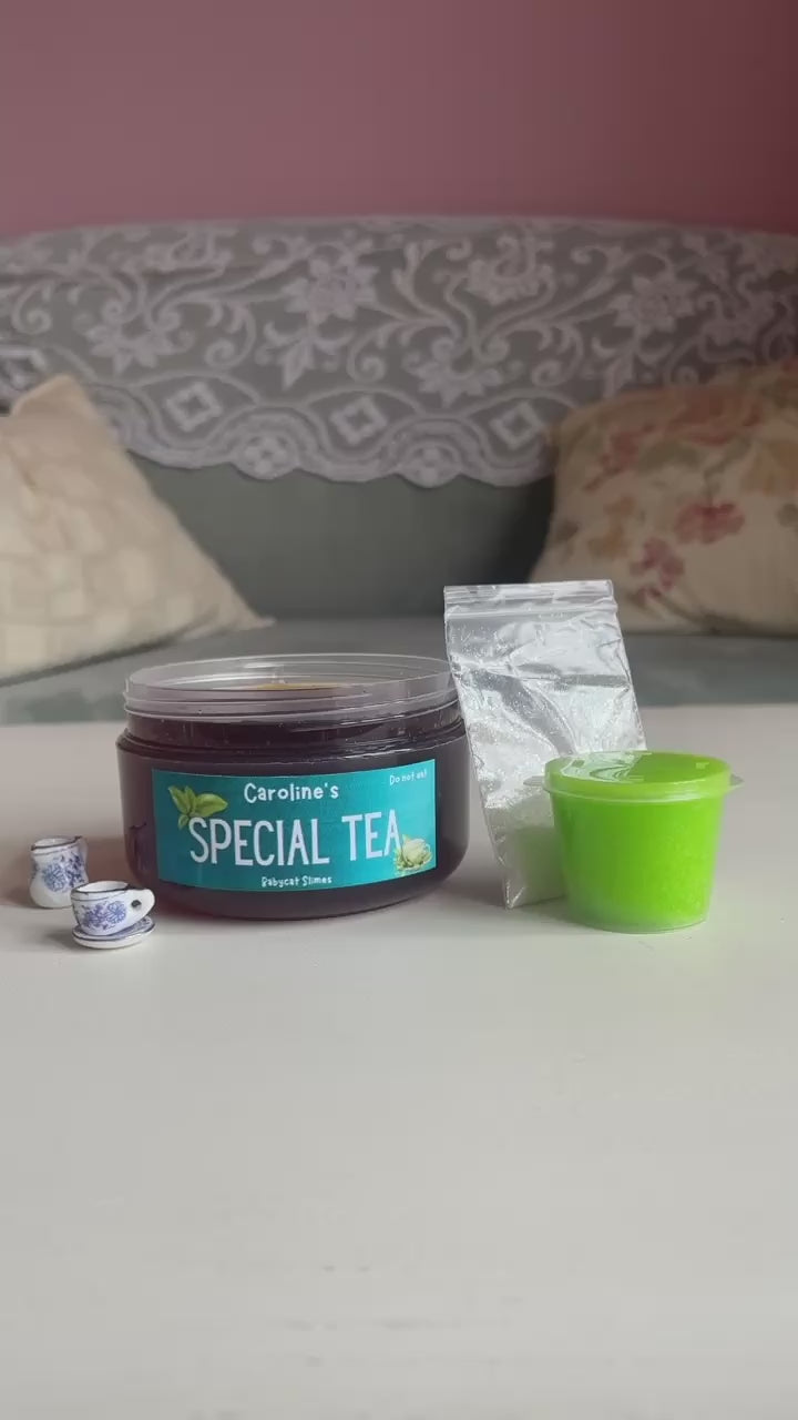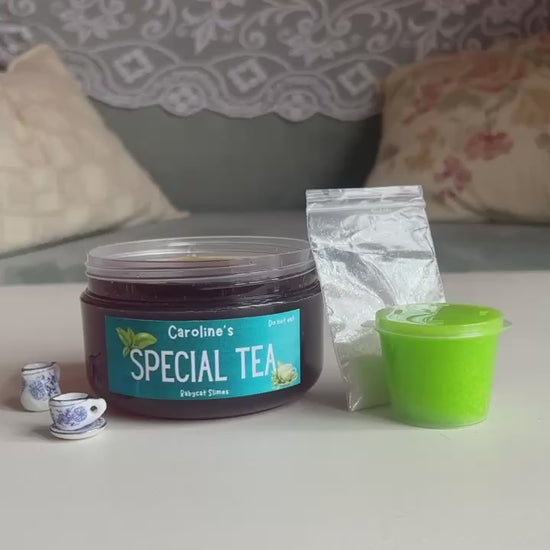 "Caroline's Special Tea" is inspired by the cutscene with Caroline in the video game Stardew Valley. It's tea-coloured coated clear slime with a separate green icee topper, which mix together to create a jelly slime. When played with it turns a pretty caramel-amber color, and then turns back to a dark tea color when the air bubbles dissipate again. It comes with glitter to decorate the top, as well as a mini porcelain tea cup on a tea plate + one other tea set accessory (at random).