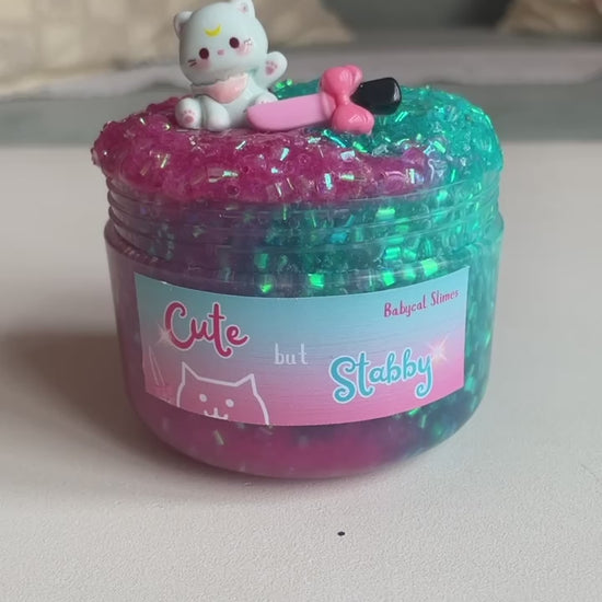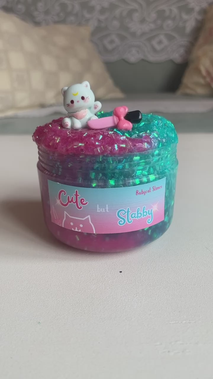 "Cute but Stabby" is a clear slime base with bingsu beads which give it a nice texture while still being gentle on the hands. It also makes great ASMR bubble pops! Comes with adorable cat and knife charms.