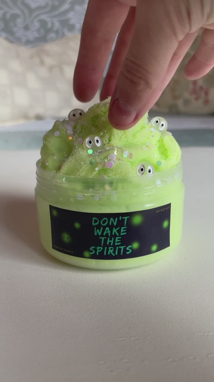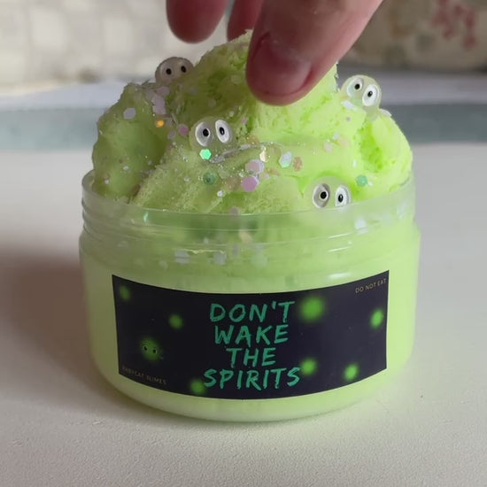 "Don't Wake The Spirits" is a light green cloud slime with glitter and cute little spirit charms. Cloud slime is damp to the touch, and when stretched a lot it gets super soft and fluffy! It's a good beginner slime. The scent of this slime is sweet, rich, and just a bit earthy.