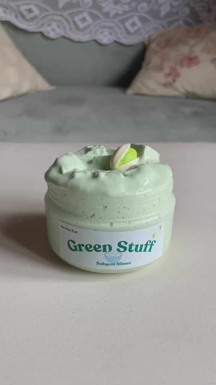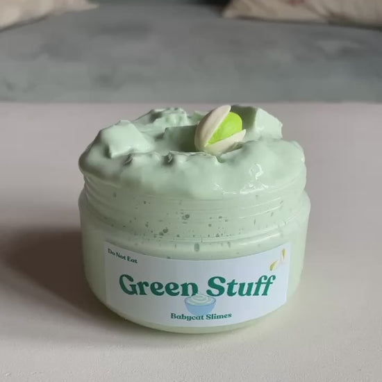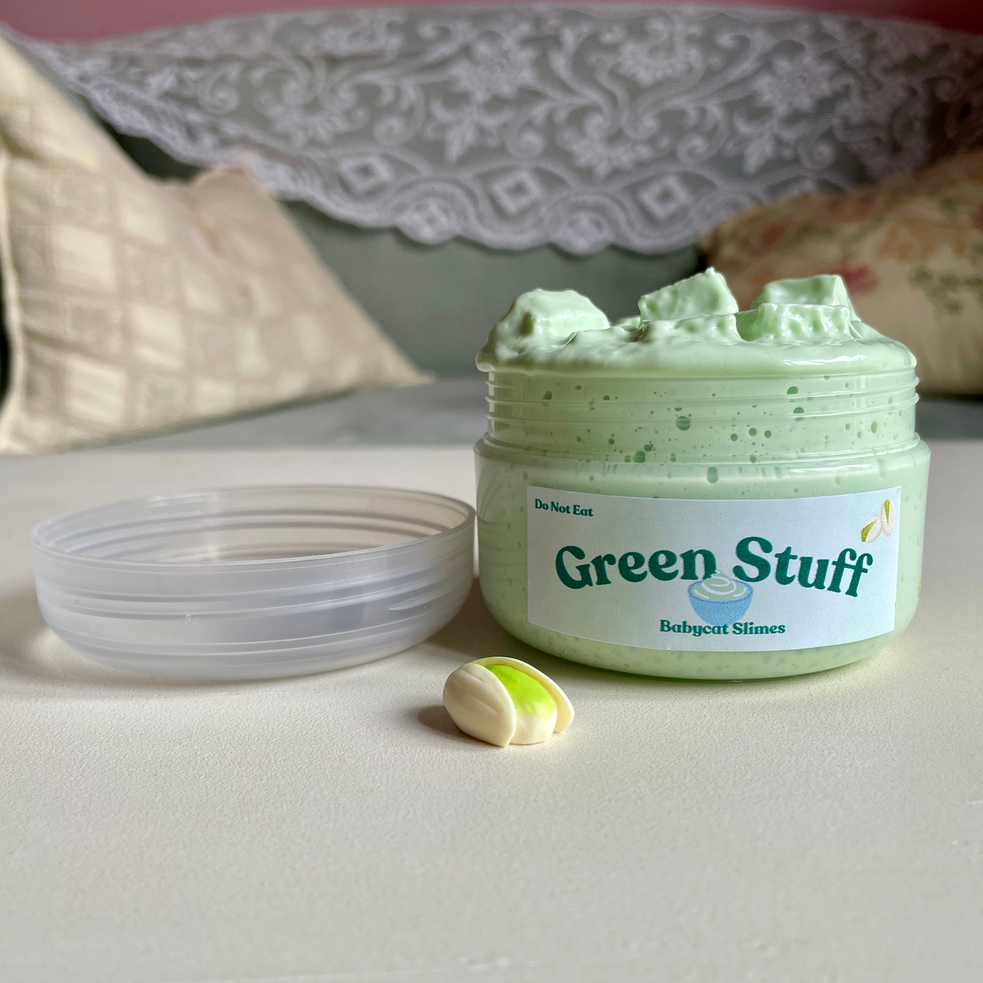 "Green Stuff" is based on the classic US midwestern dessert salad, formally called "Watergate salad" but more commonly known in my hometown as simply "green stuff". It's a fluffy sweet dish made from Cool Whip, mini marshmallows, instant pistachio pudding mix, walnuts, and a can of crushed pineapple. This slime looks and smells just like the real thing, and makes me homesick for my Indiana hometown! The silica slushee beads look like the pieces of crushed walnut, and the jelly cubes act as the marshmallows. The scent is absolutely spot-on, it smells so delicious! The slime itself is a creamy light green slay slime, and the slushee beads sink to the bottom of the slime - making it fun to re-mix them in every time you play.