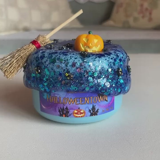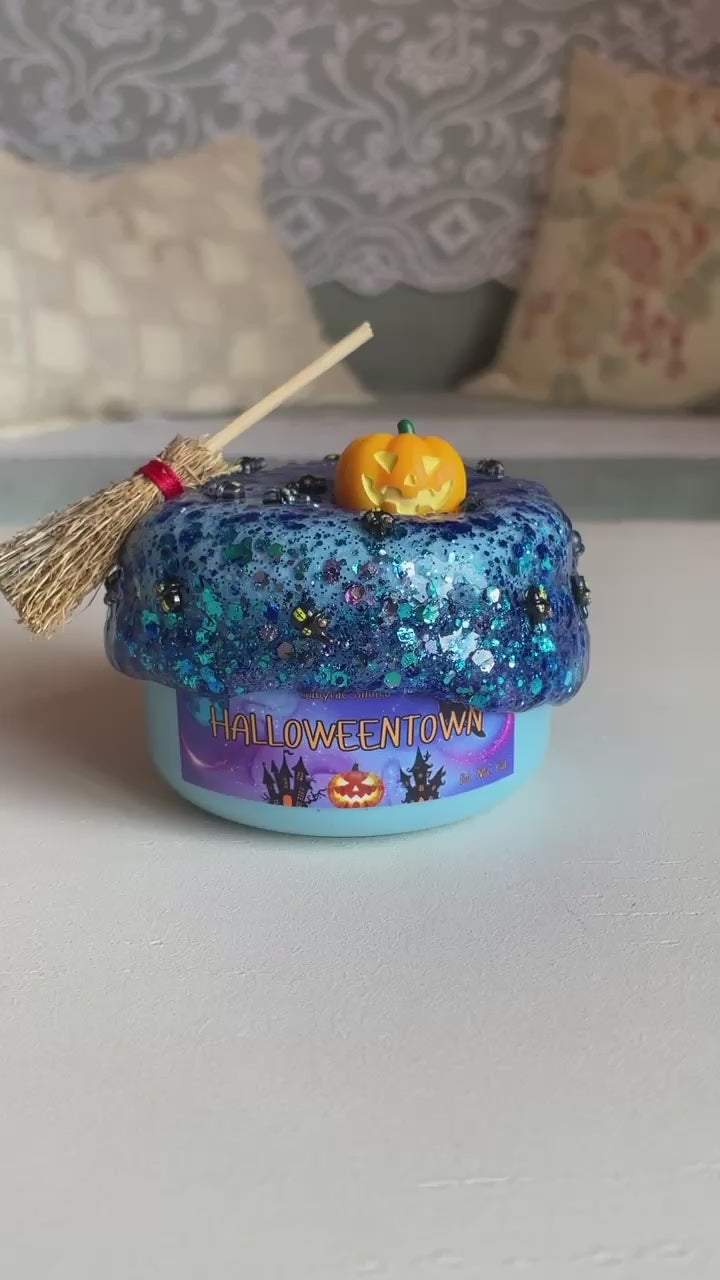 "Halloweentown" is a white glue (WG) jelly slime with a clear glitter-bomb topper, and comes with a jack-o-lantern and witch's broom charms. This slime makes great ASMR - so many loud bubble pops! - and gets very poofy and soft with play.