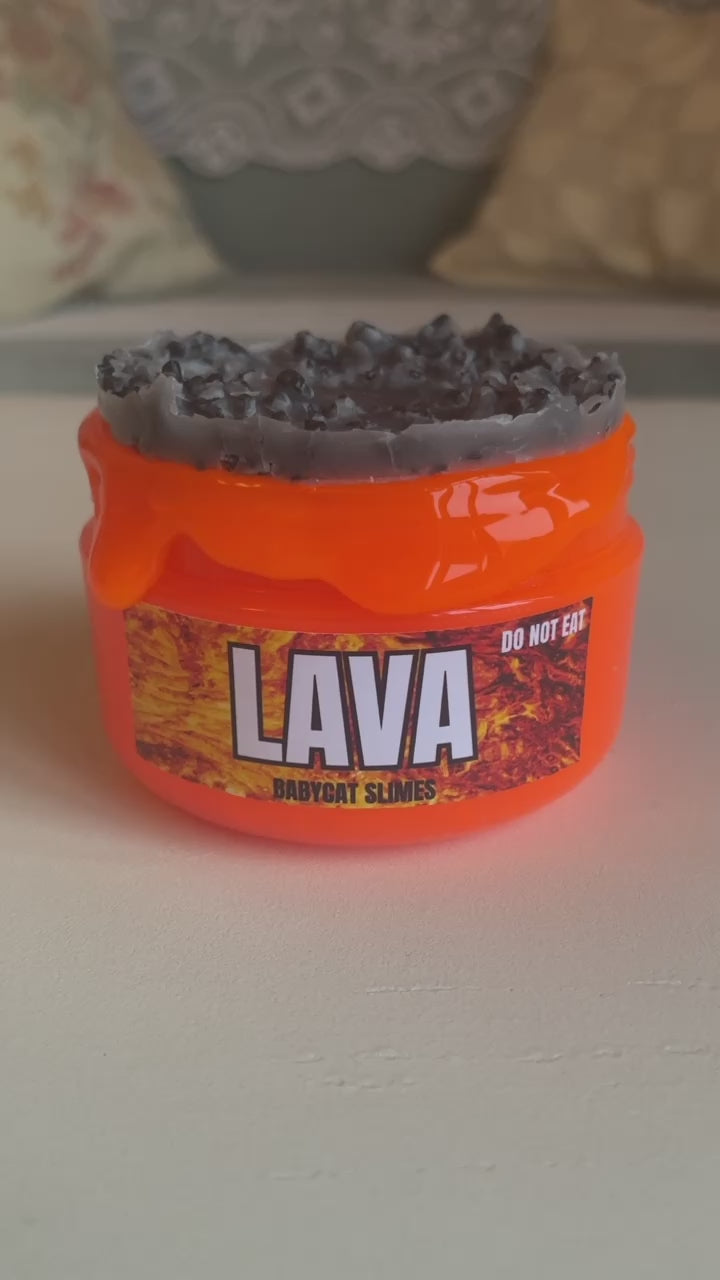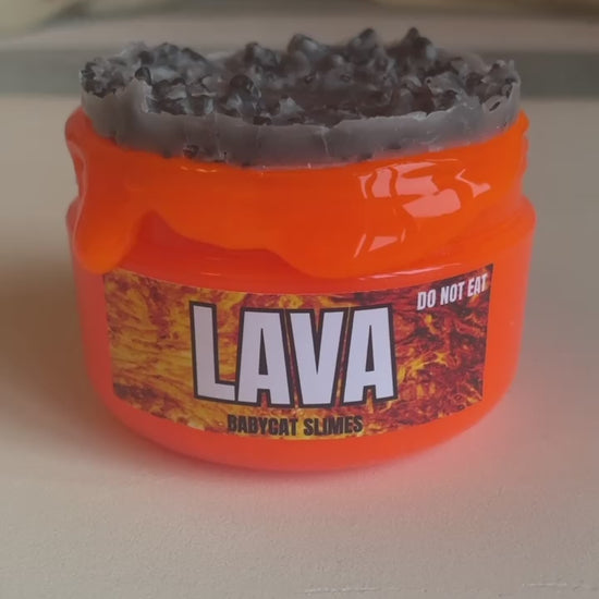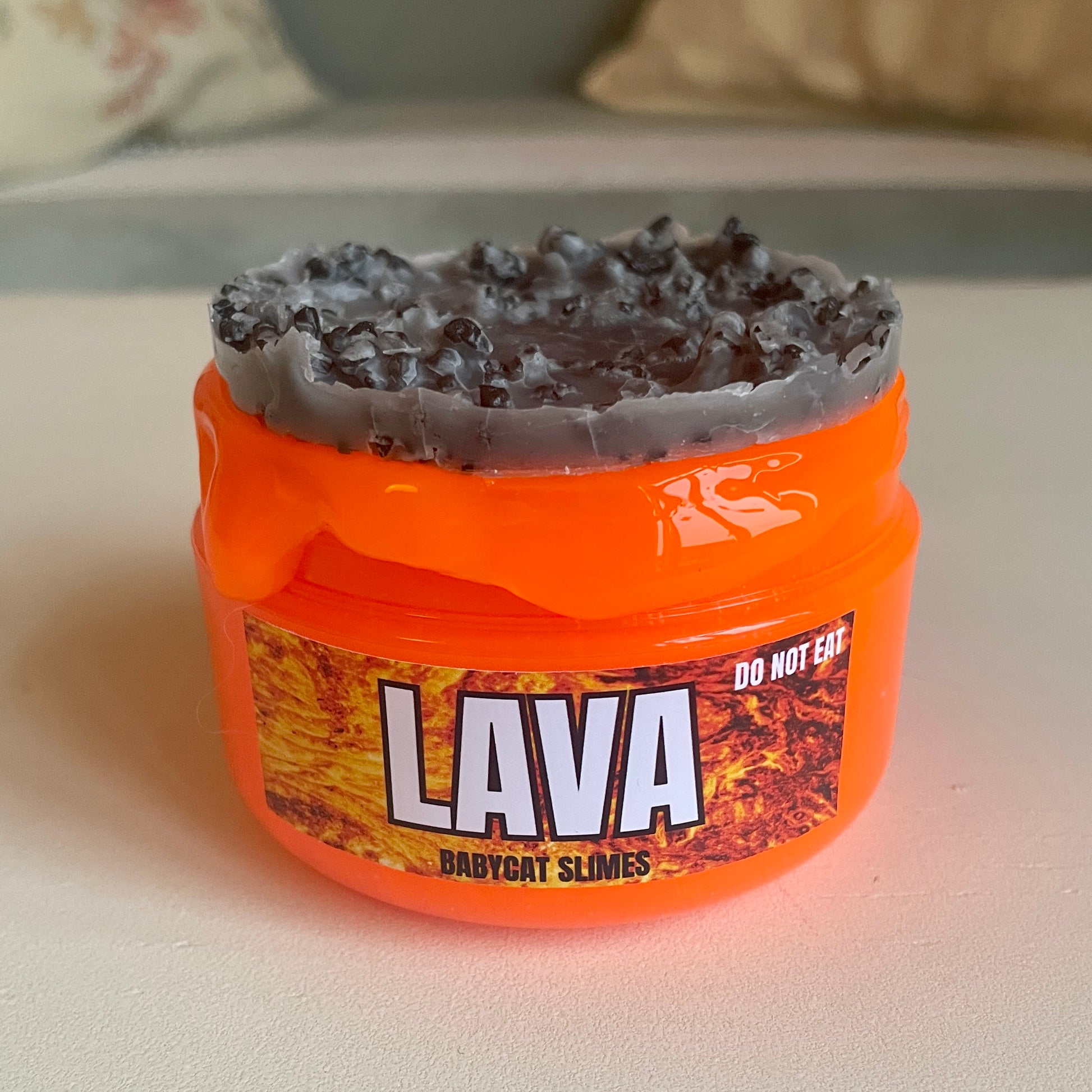 โLAVA" is a coated clear slime with a crackable wax topper. It also comes with a little bag of black rocks in case you want more CRUNCH in your lava slime! The color is an extremely vibrant orange, it looks like it's glowing!ย