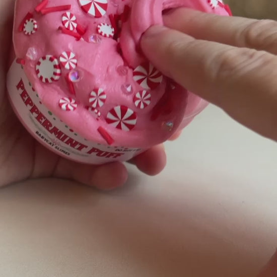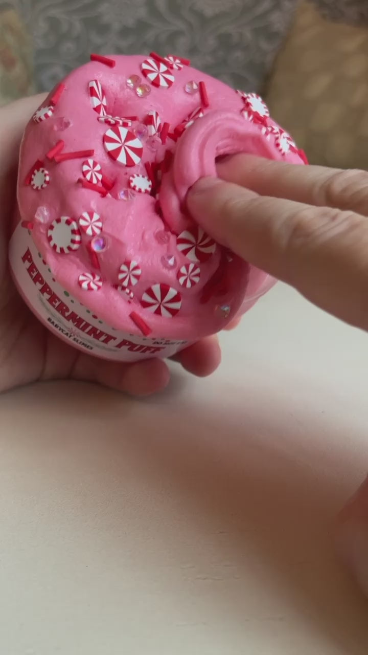 "Peppermint Puff" is a pink snowbutter texture slime with peppermint clay confetti and a toy candy cane charm. It is scented like peppermint bark and smells so yummy! Snowbutter is a great beginner texture, being soft, stretchy, and holdable. It is also very sizzly when inflated and makes great ASMR!