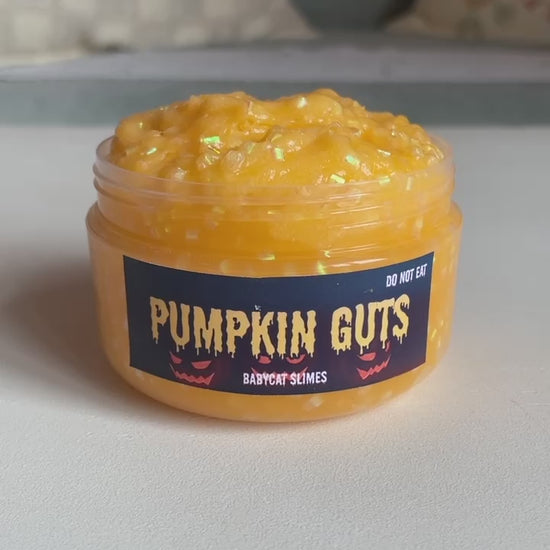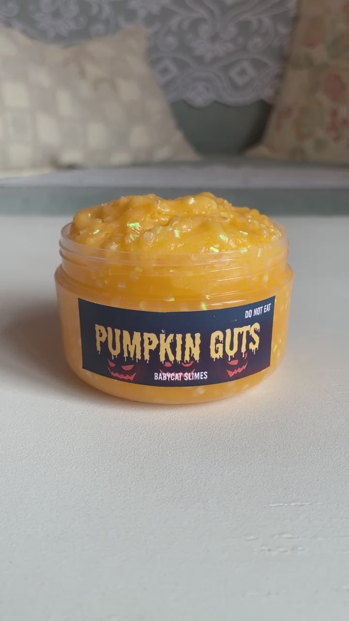 "Pumpkin Guts is a jelly slime with bingsu beads. The texture is nice and crunchy but not abrasive, and makes great ASMR- crispy crackles and bubble pops!