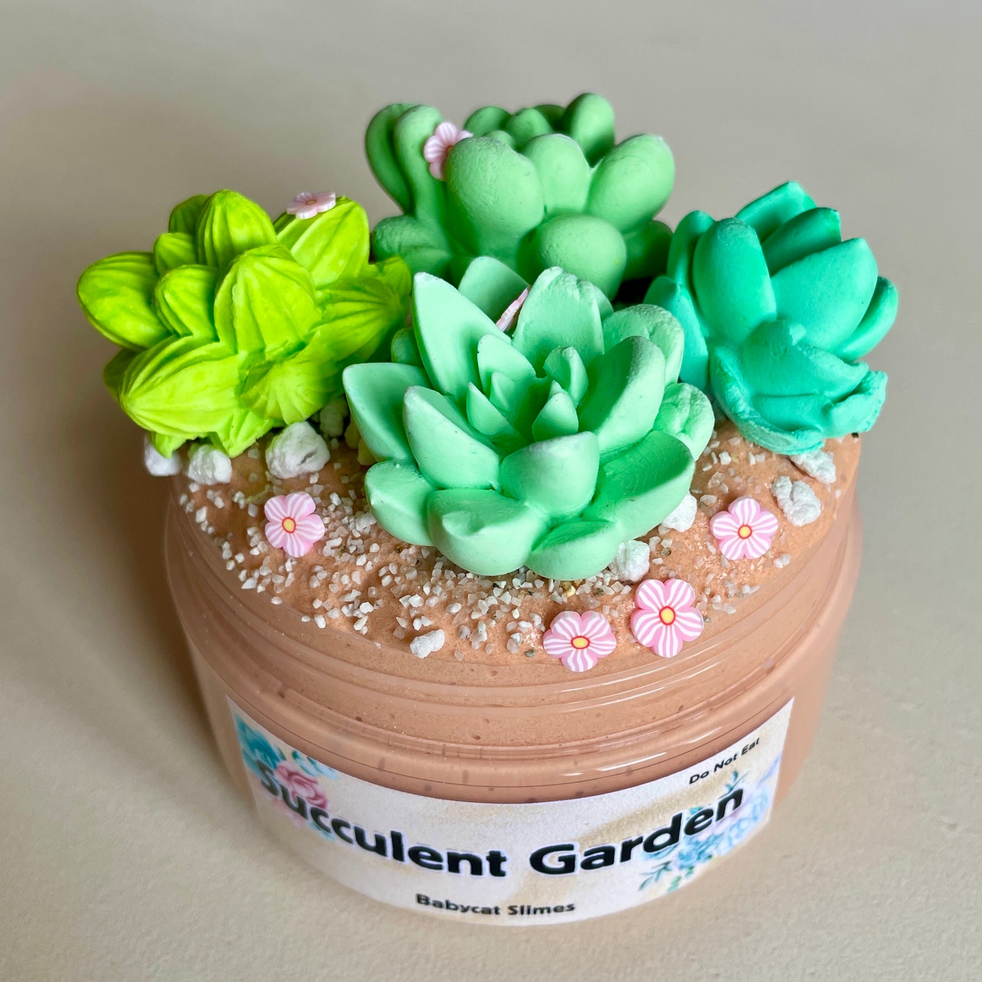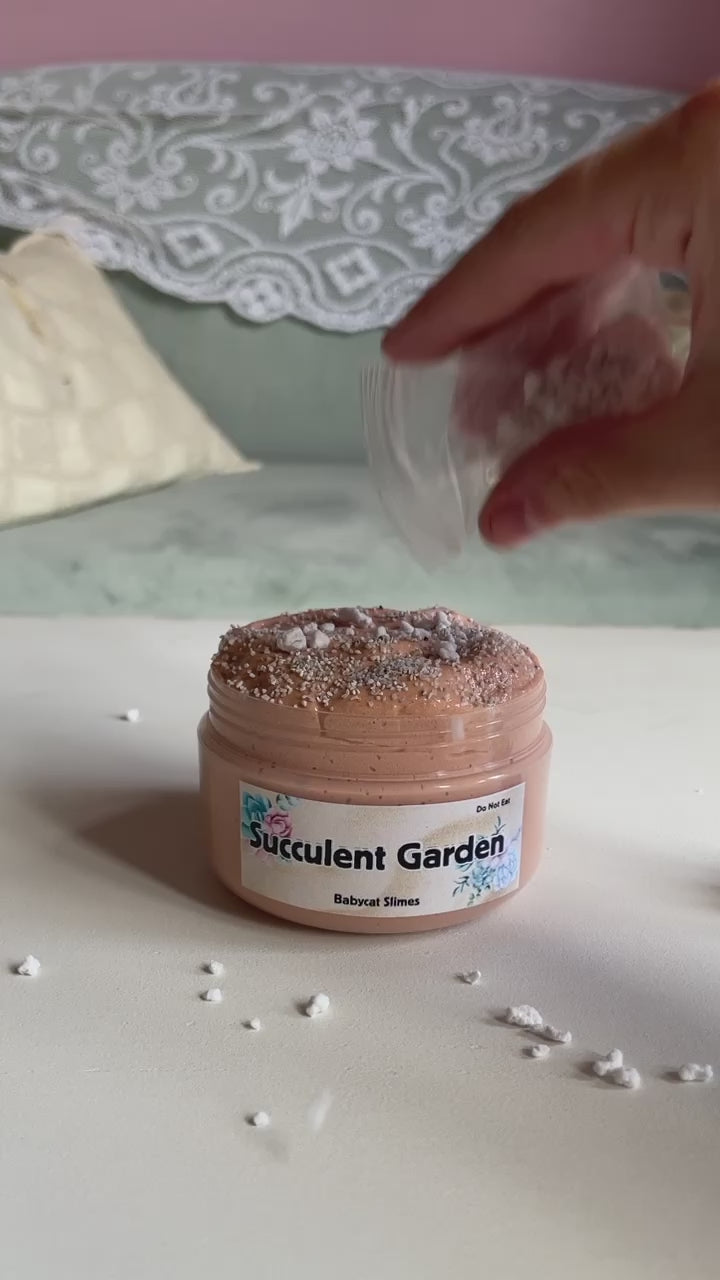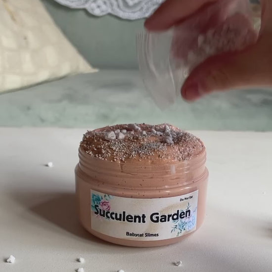 "Succulent Garden" is a cloud creme slime with DIY clay succulent plants in different shades of green that you can squish and mix into the slime. It comes with a baggie of sand, perlite rocks, and flower-shaped clay slices to decorate and add texture to the slime. When you've put it all together it looks so cute, you almost won't to mix it up! It looks just like a little garden in a slime pot.