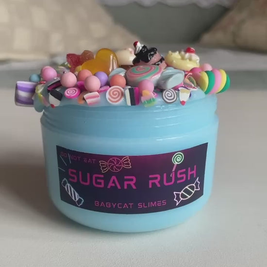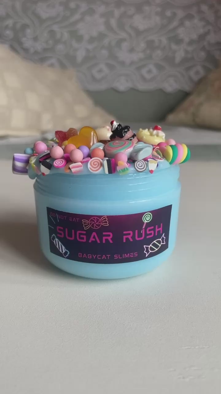 "Sugar Rush" is a baby blue jelly slime with candy clay fimos, multicolour pastel balls, and adorable assorted candy charms. It makes great ASMR bubble pops and inflates quite a bit with play.