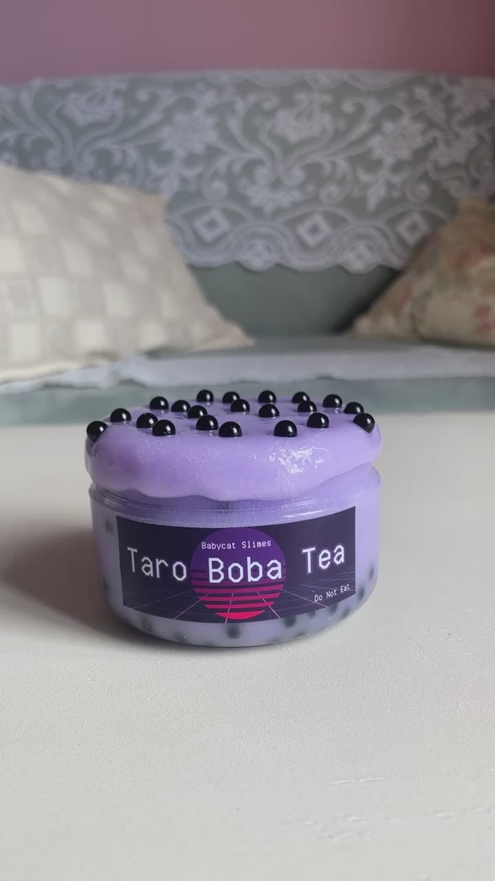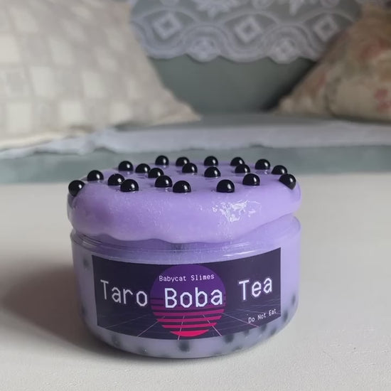 "Taro Boba Tea" is a milky clear slime with black bead "tapioca pearls", and smells like a cozy boba tea shop. It makes amazing bubble pops and inflates with play.ย